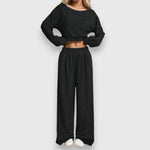 Modernus 2-dalių komplektas su be rankovių džemperiu ir plačiomis kelnėmis su raišteliu. Idealiai tinka atsitiktiniam, sportiškam stiliui.
