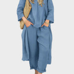Šis stilingas lininis komplektas tamsiai mėlynos spalvos derina paprastą eleganciją ir kasdienį praktiškumą. Puikiai tinka vasaros išvykoms, suteikia judėjimo laisvę ir lengvą eleganciją.