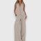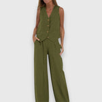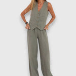 Nina komplektas derina vasaros lengvumą su elegantišku paprastumu – idealiai tinka šiltoms dienoms ir stilingiems pasirodymams. Be rankovių viršus su siaura linija susitinka su laisvais kelnėmis, taip suteikdamas modernią, kūną formuojančią siluetą.