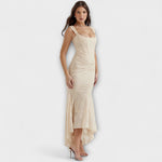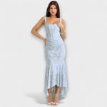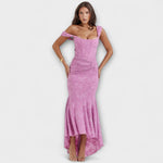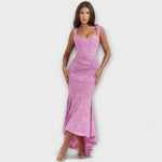 Ši nuostabi ilga suknelė švelnios alyvinės spalvos sujungia eleganciją ir moteriškumą, su romantiškais akcentais ir figūrą apgaubiančiu siluetu. Korsetas su drapiruotu dizainu pabrėžia liemenį, o asimetrinė sijonas suteikia judėjimo ir žavesio kiekviename jūsų žingsnyje.