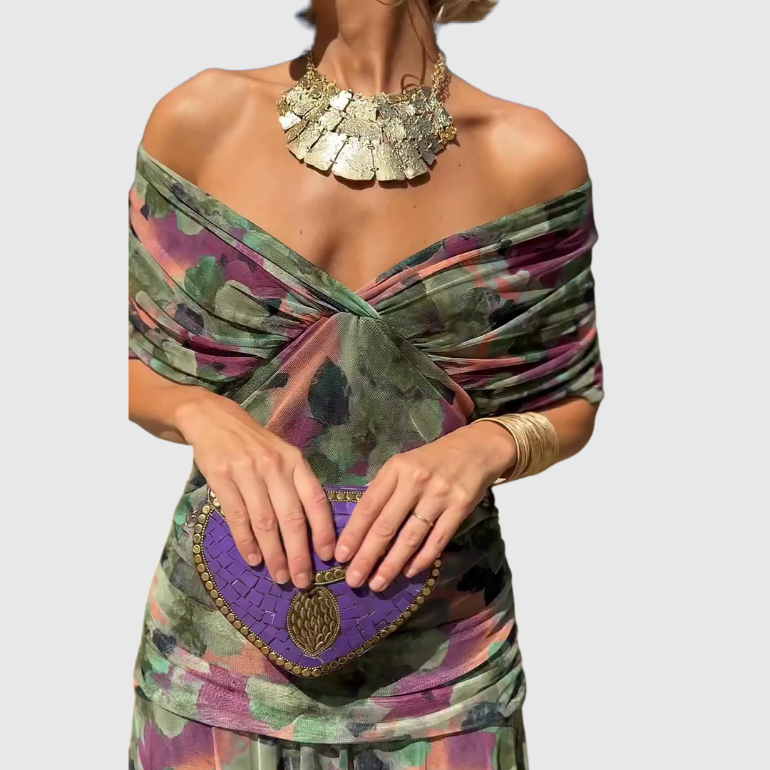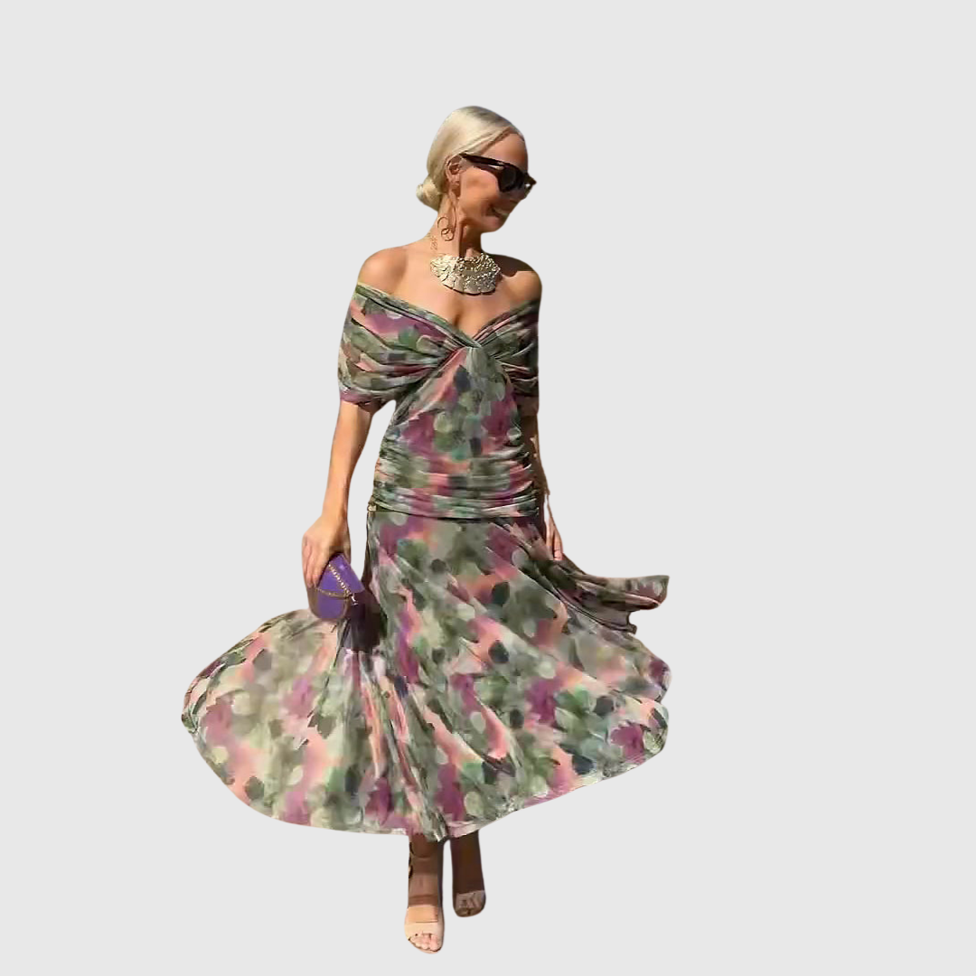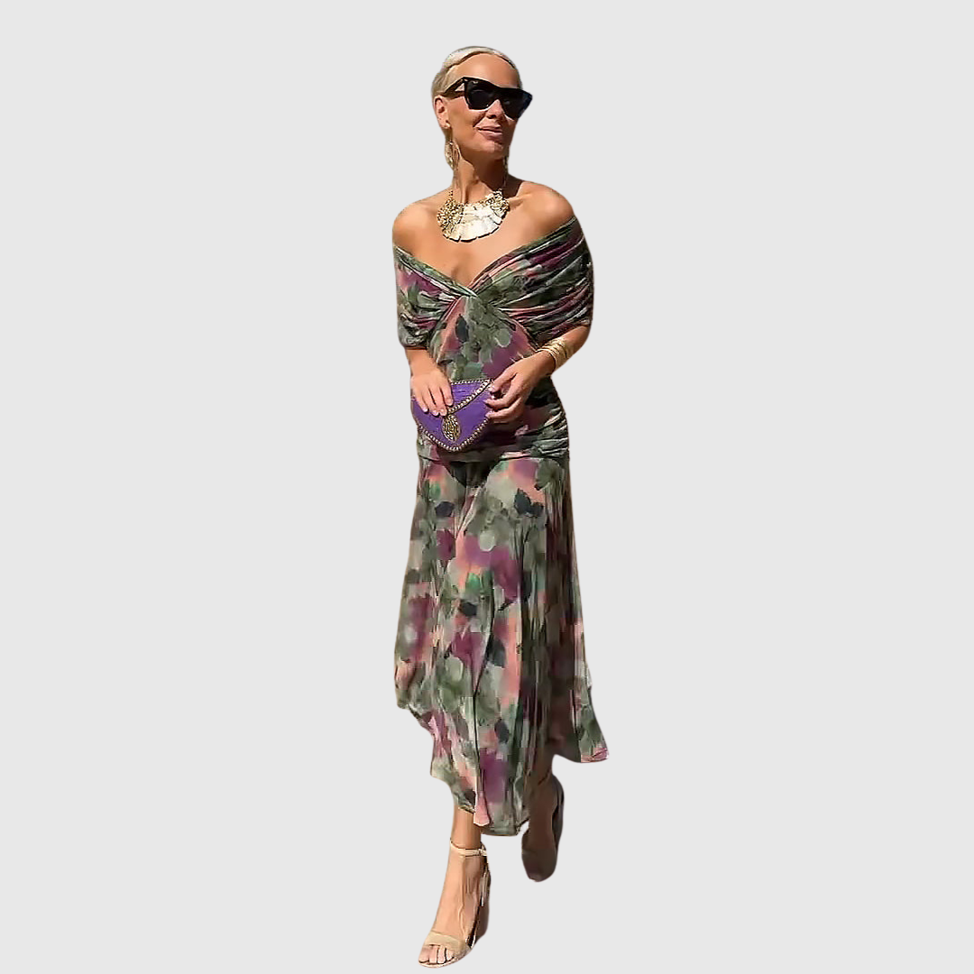 Alma suknelė yra elegancijos ir moteriškumo įsikūnijimas. Jos V formos iškirptė ir ilgas siluetas subtiliai pabrėžia figūrą.